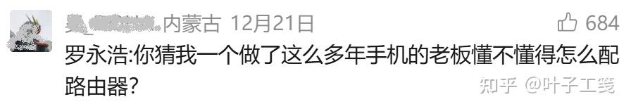 做为一家前科技公司老板,不知道老罗第一眼看到那份公告是什么心情。我倒在评论区看到一条留言嘴替:你猜我一个做了这么多年手机的老板懂不懂得怎么配路由器?