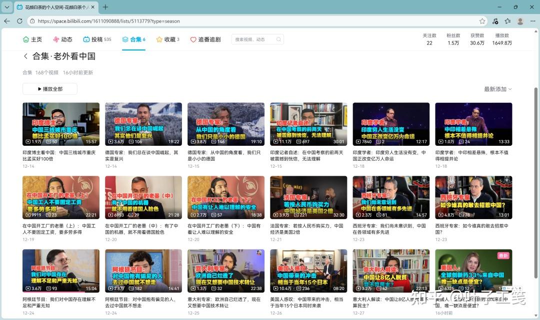 我最近在 B 站发现了一个特别长见识的合集叫《老外看中国》,主要收集国外博主讨论中国的访谈视频或者自拍视频。其中,有不少访谈对象是外交大使、专家学者以及企业主或企业高管,比如德国《商报》专栏作家弗兰克·泽林 (Frank Sieren)、法国经济情报专家 Alain Juillet、阿根廷(现任)驻华大使牛望道、德国原材料供应商 TRADIUM 公司的首席执行官 Matthias Rüth 以及今年刚刚访华的德国代表团和印度代表团成员。