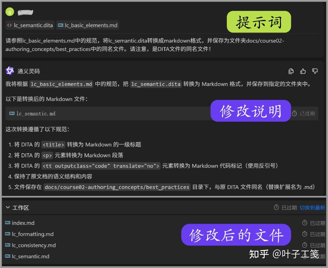 我最近在用通义灵码的文件编辑功能进行格式转换。源文件是 DITA 文件,目标格式是 Markdown。更准确的说,是启用了 PyMdown 扩展的 Python-Markdown。总之就是说,没有任何现成的格式转换器可以直接进行转换,即使使用编程进行自动化转换也挺复杂的。